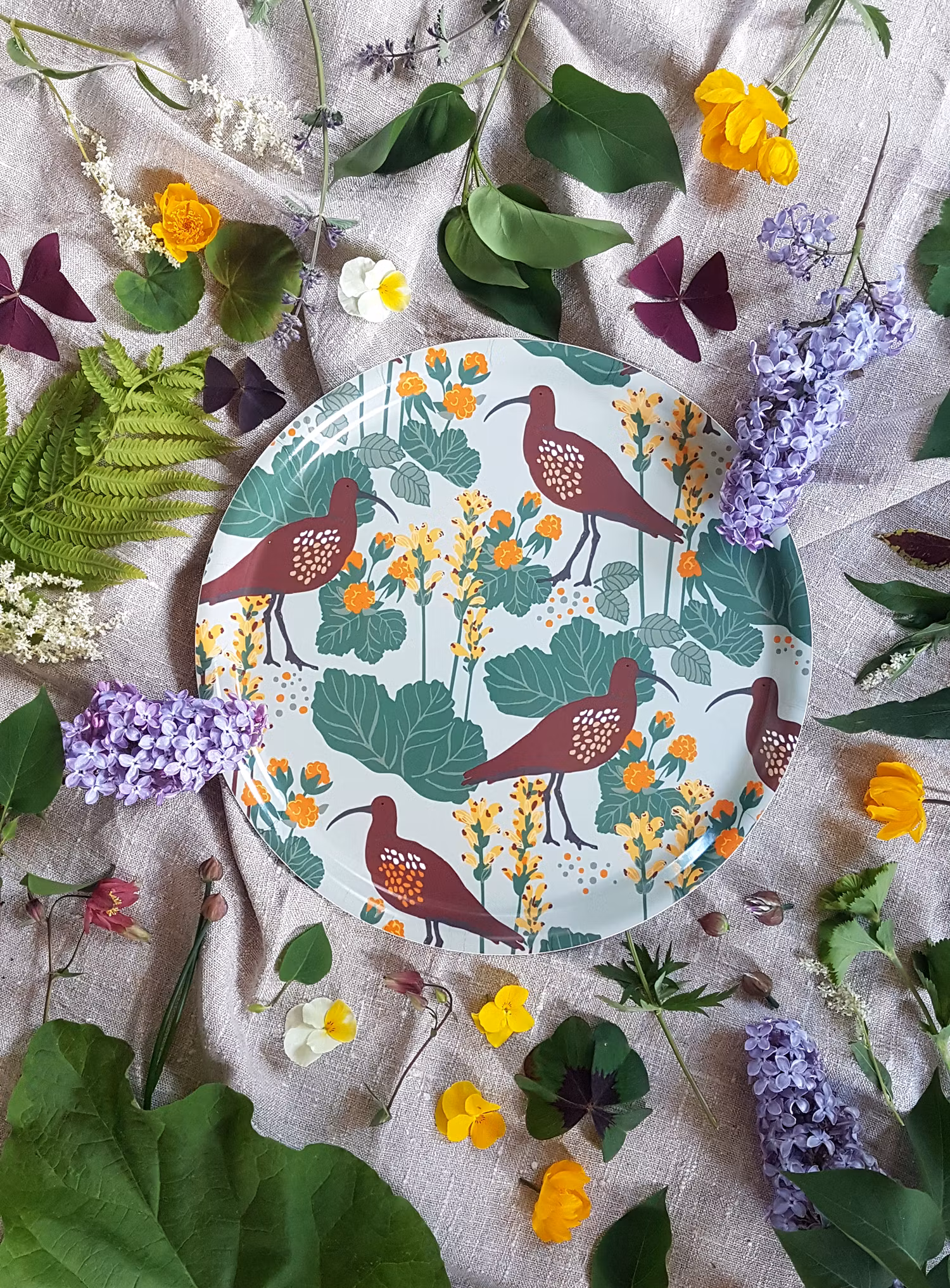 Ett mönster med storspoven, hjortron och landskapsblomman Kung Karls spira. Ett mönster som för tankarna på klassisk svensk mönsterdesign. Brickan är tålig och tillverkad av formpressad björk.