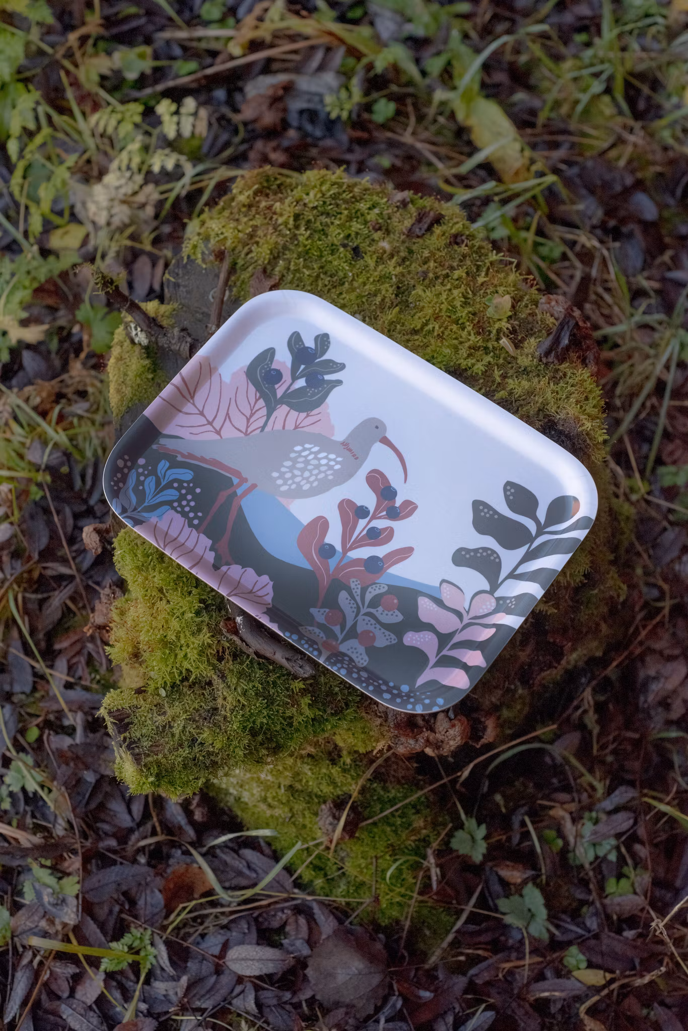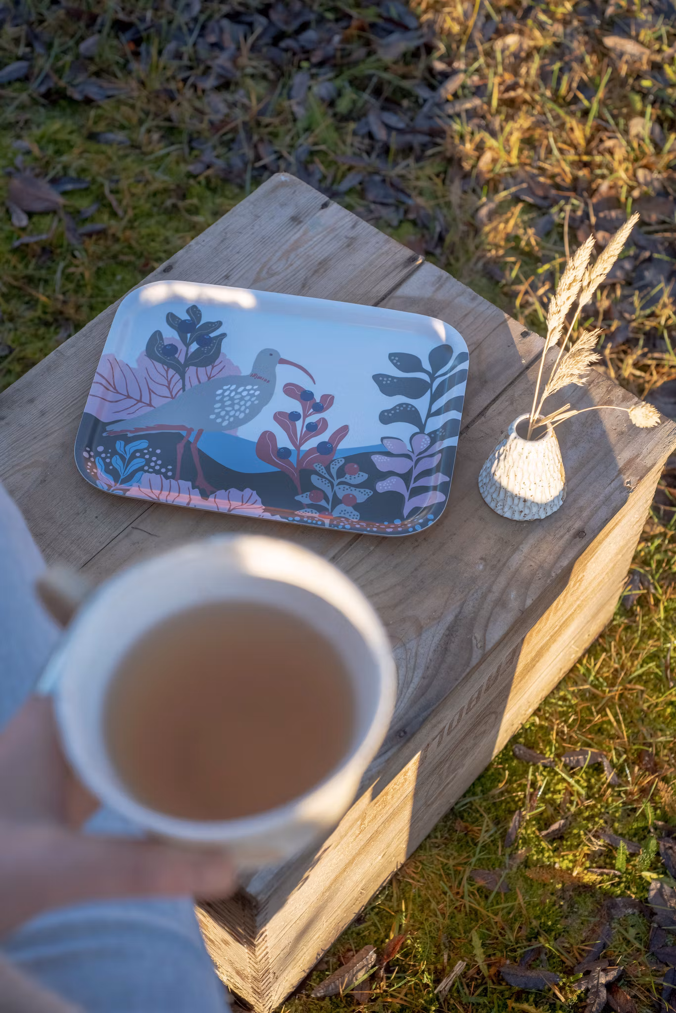 En bricka för alla fikastunder i trädgården eller som en inredningsdetalj till hemmet. Brickan är tålig och tillverkad av formpressad björk. Ett motiv med storspoven, lingon och blåbär.