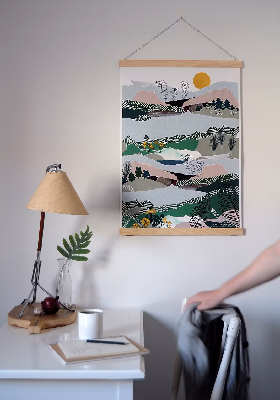 Motivet Fjällvandringen är tryckt på ett exklusivt och kraftigt papper av ett lokalt tryckeri i Umeå. Motivet är ett kollage med en taktil känsla av rivet papper, färg och illustrationer.